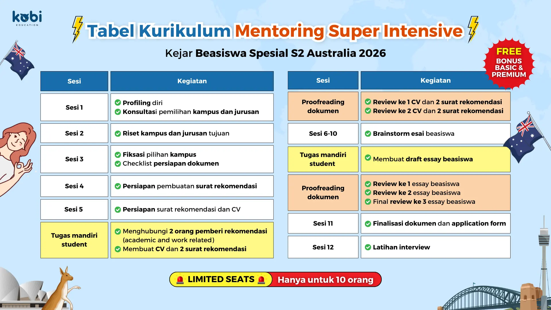 Mentoring Super Intensive edisi Australia dirancang khusus untuk kejar persiapan studi S2 ke Australia. Mulai dari kurikulum hingg bonus mentoring bisa support kamu untuk apply beasiswa S2 Australia dan berburu LoA kampus impian.