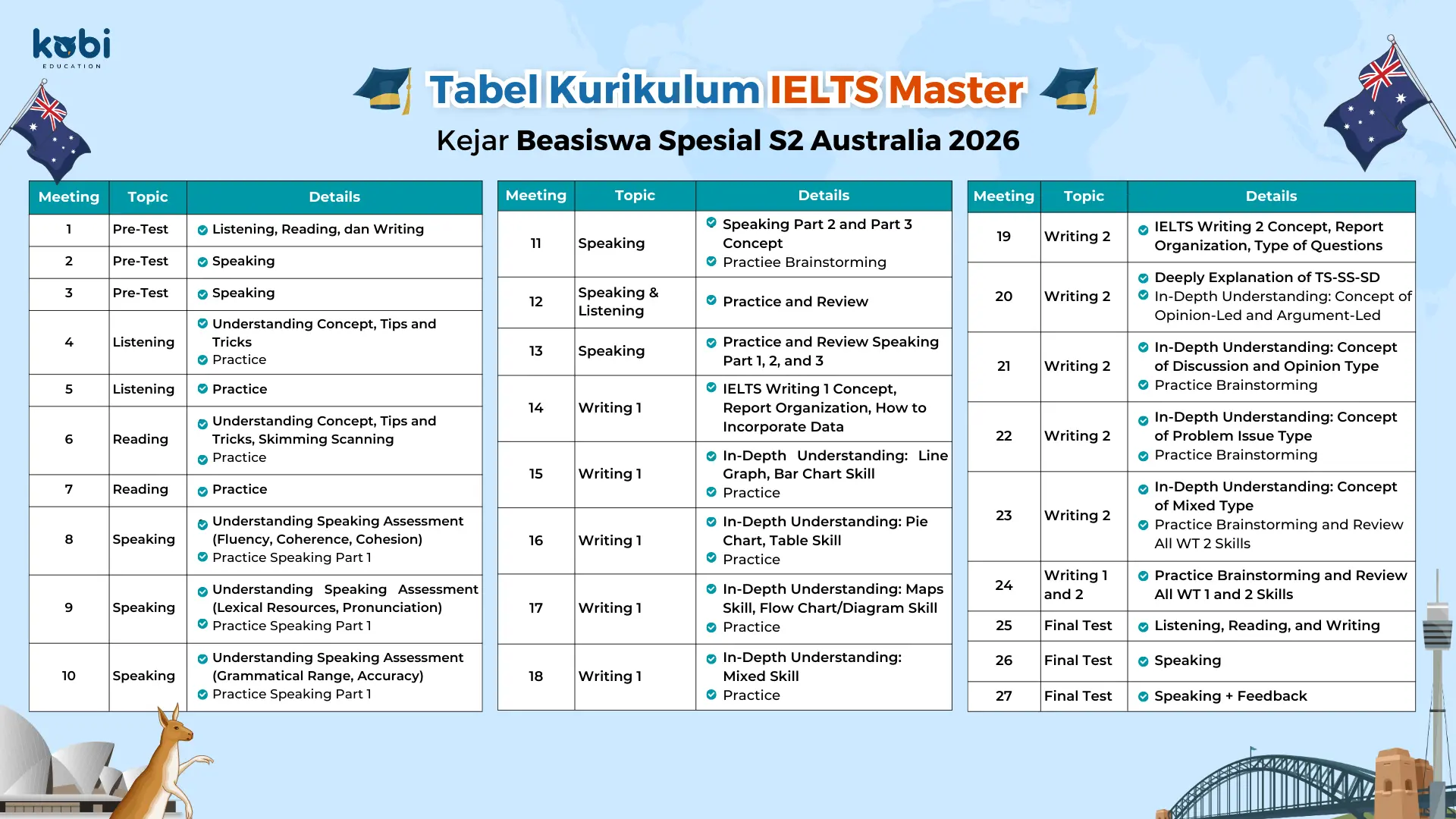 Sangat dianjurkan untuk memiliki IELTS karena bisa dapat tambahan poin 90%, tetapi kalau belum punya bisa ikut IELTS Preparation di Kobi😊